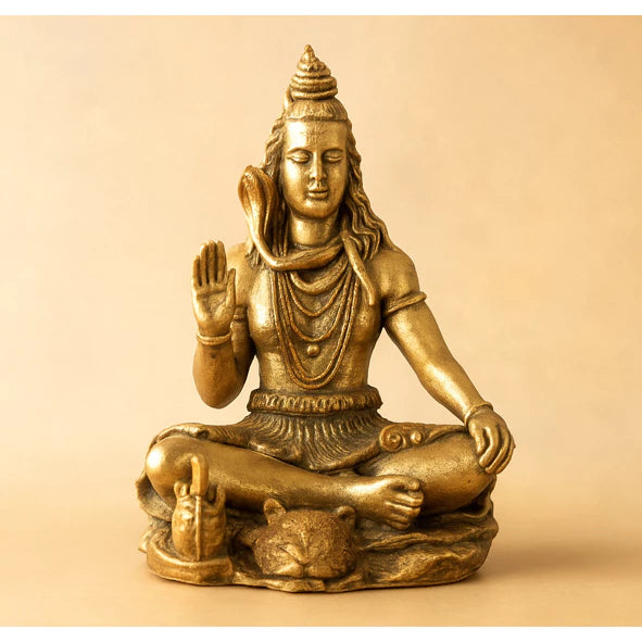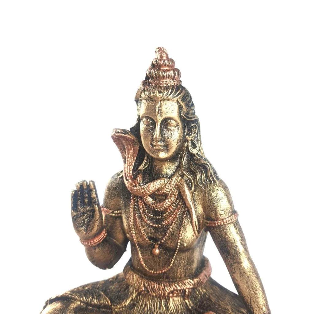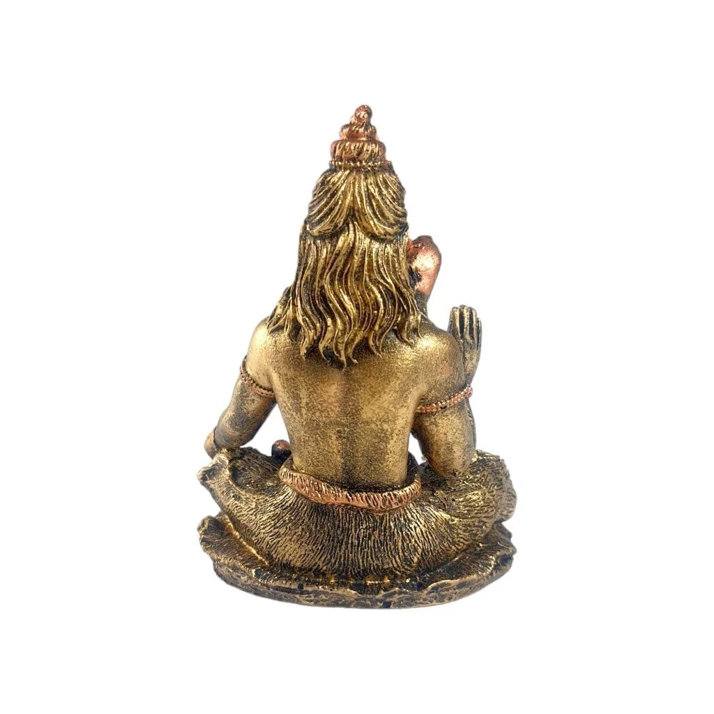 Características do Produto: Material: Resina de alta qualidade, resistente e durável Pintura: Acabamento artesanal com detalhes em tons bronze e dourado envelhecido Design: Shiva em posição de lótus (meditação), com mão levantada em gesto de bênção (Abhaya Mudra).