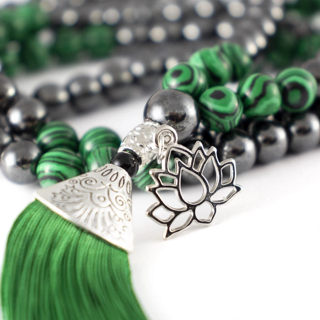 Japamala 108 Contas Hematita Malaquita Flor de Lótus